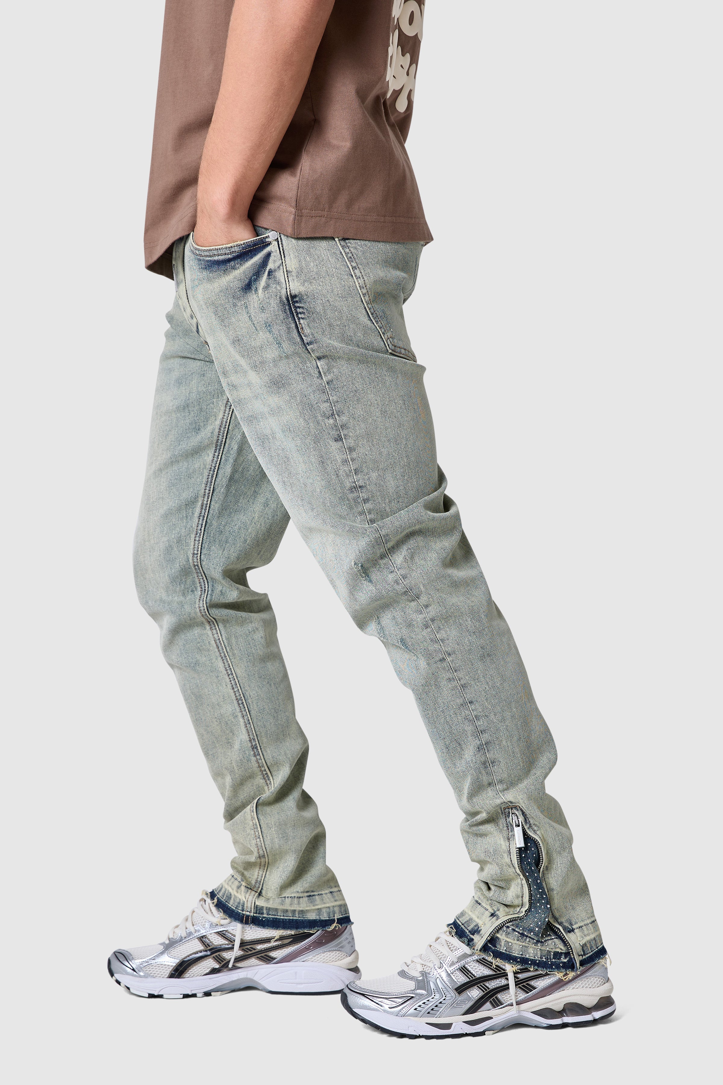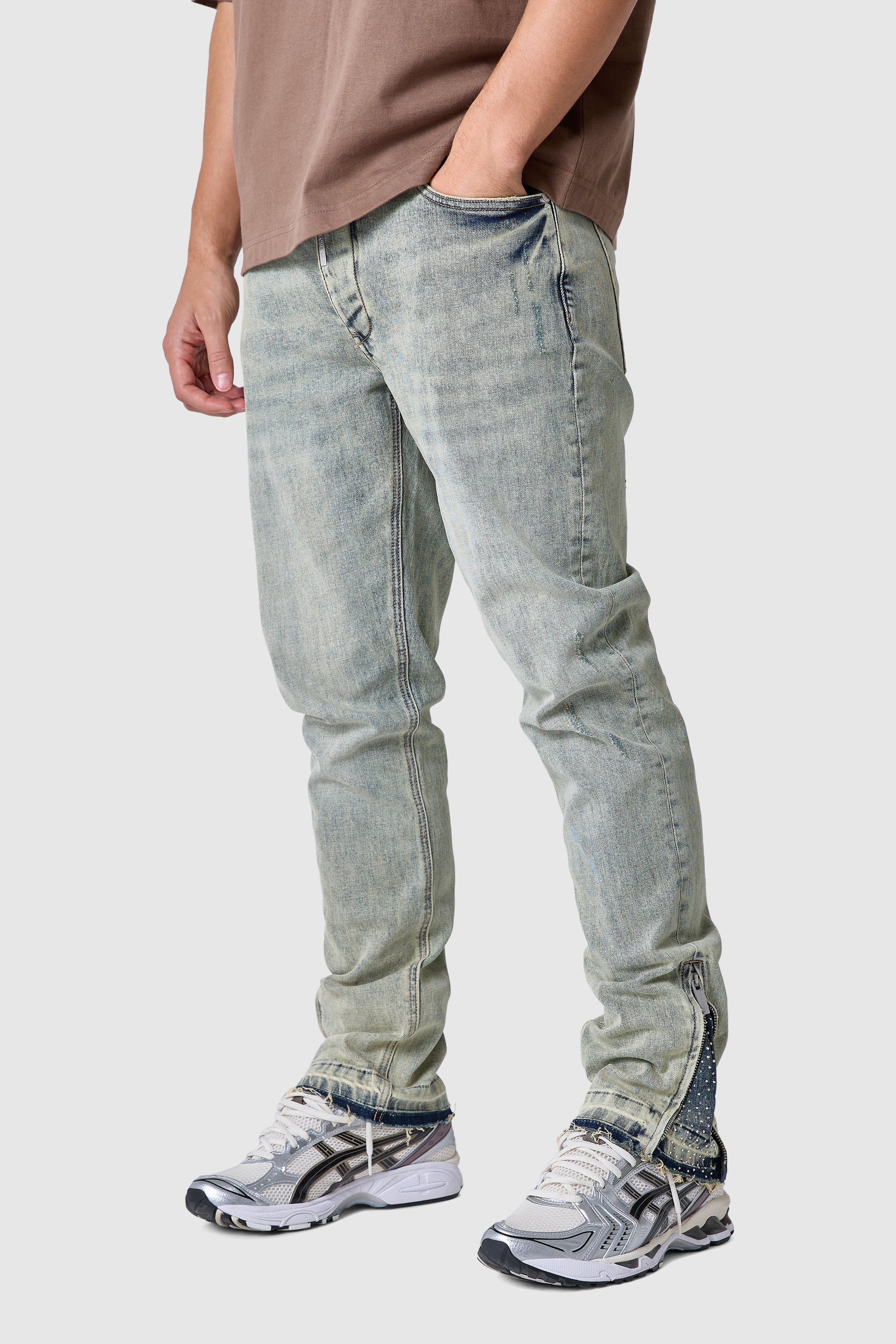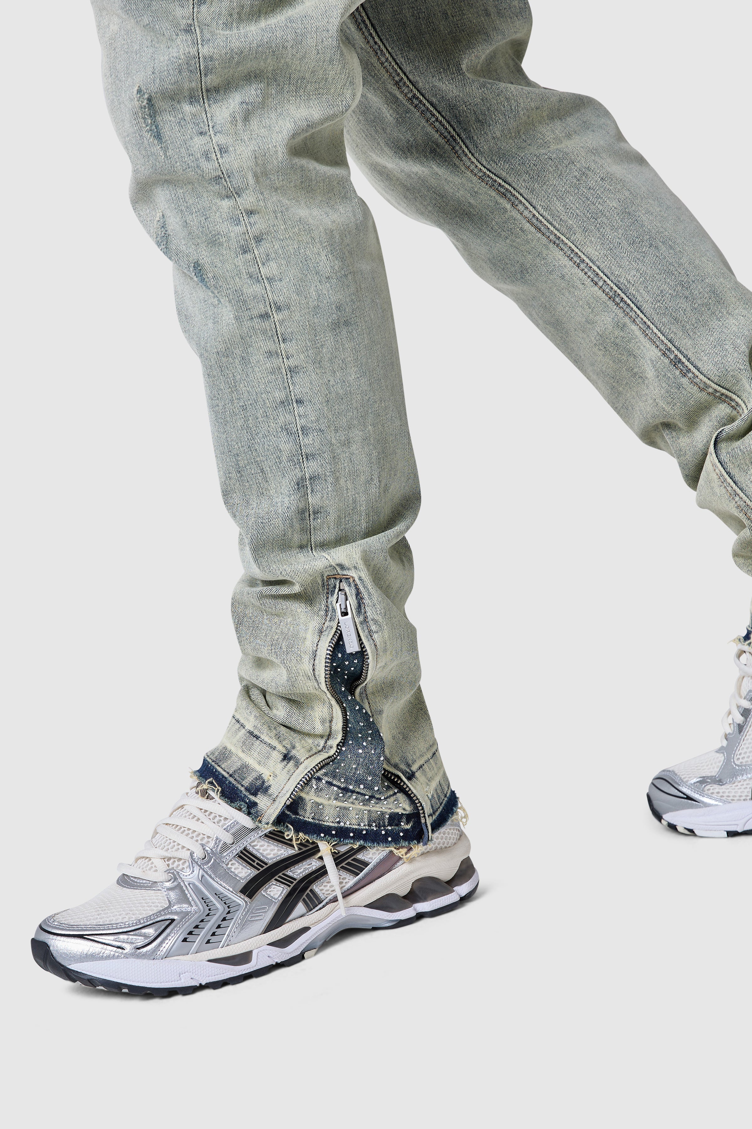 Crafted for a streamlined profile with effortless stacking over footwear, this jean is made in a washed-out light denim with subtle distressing and layered ankle zip detailing, which when worn open showcases an embellished aesthetic for added character.
