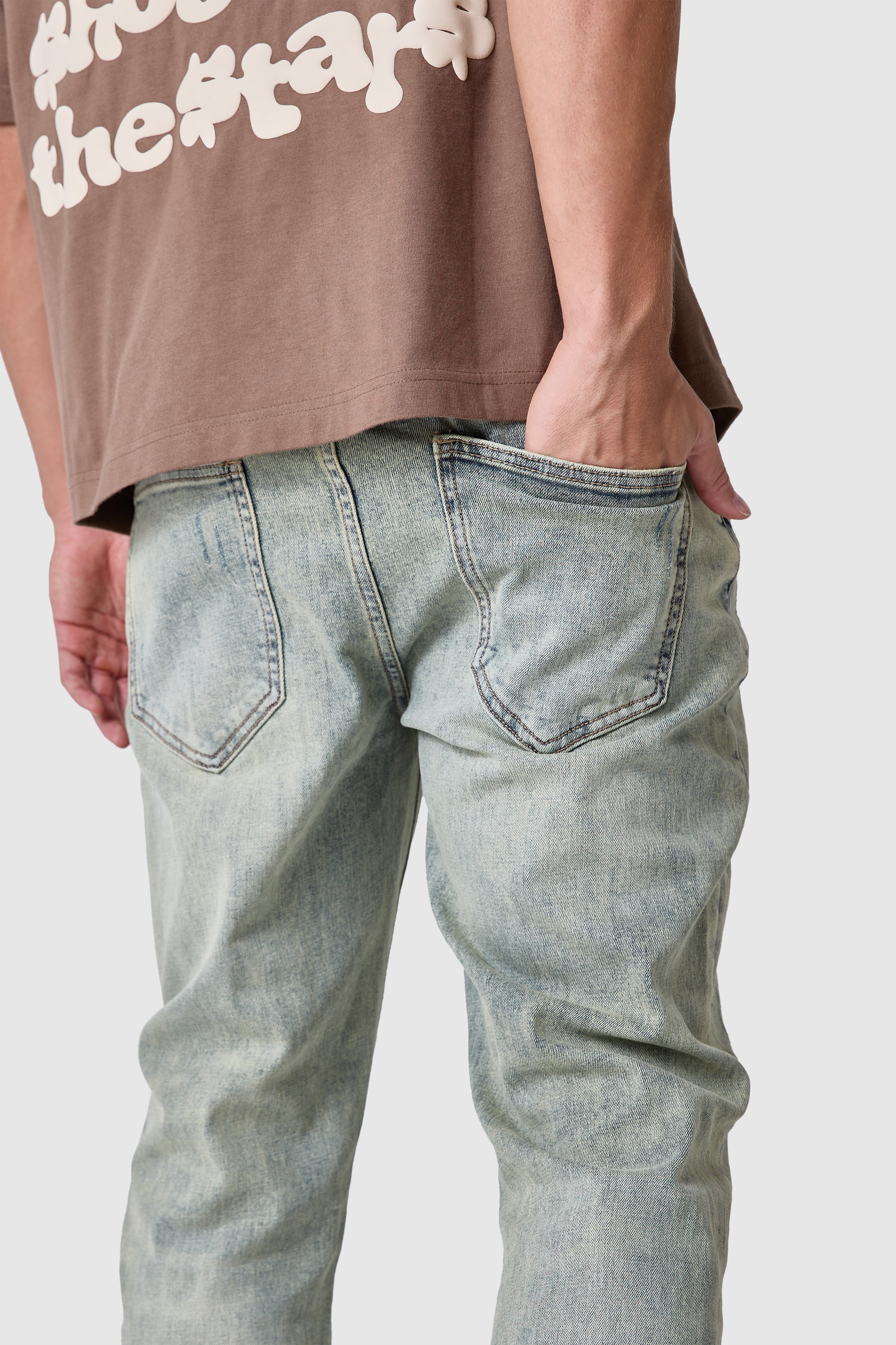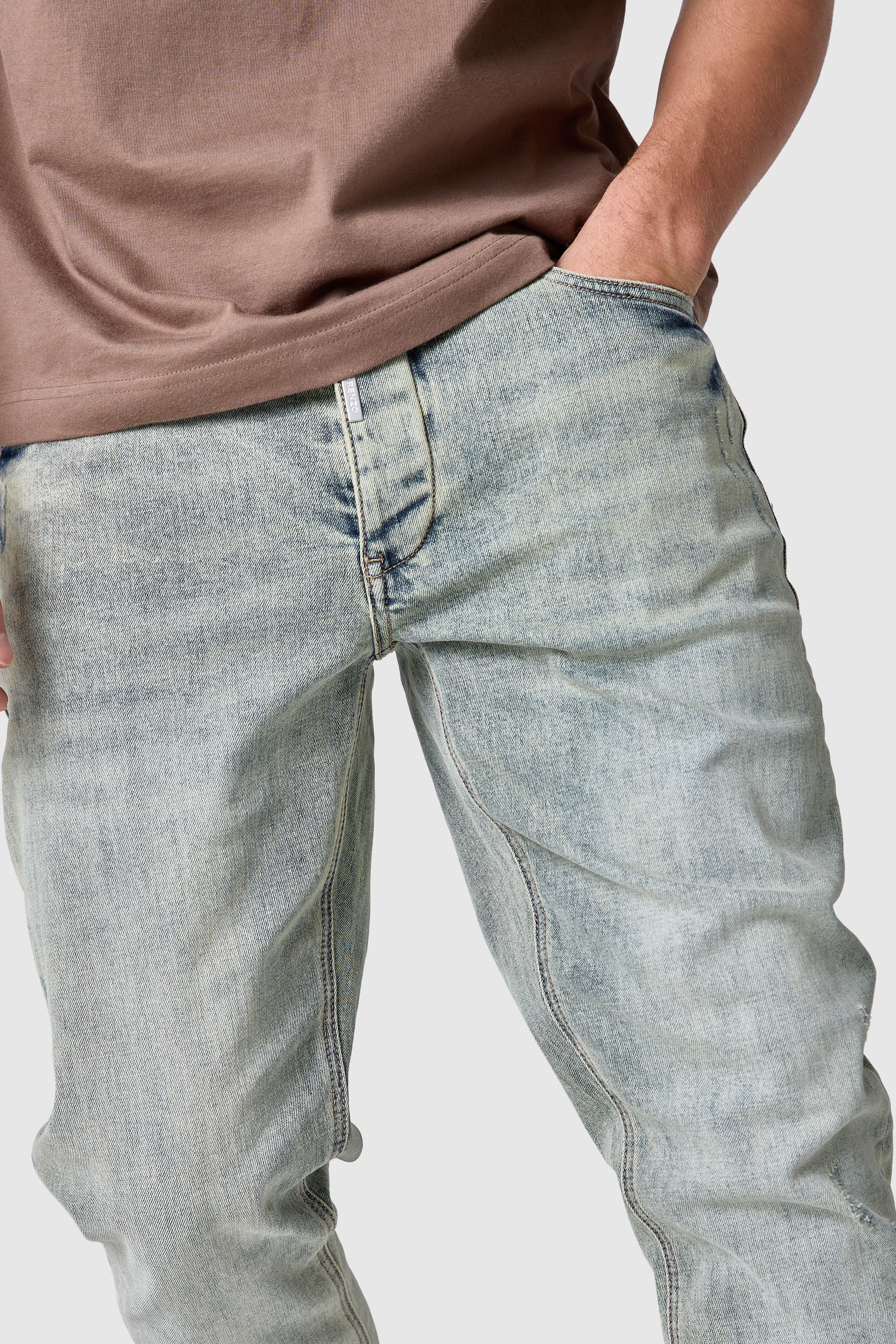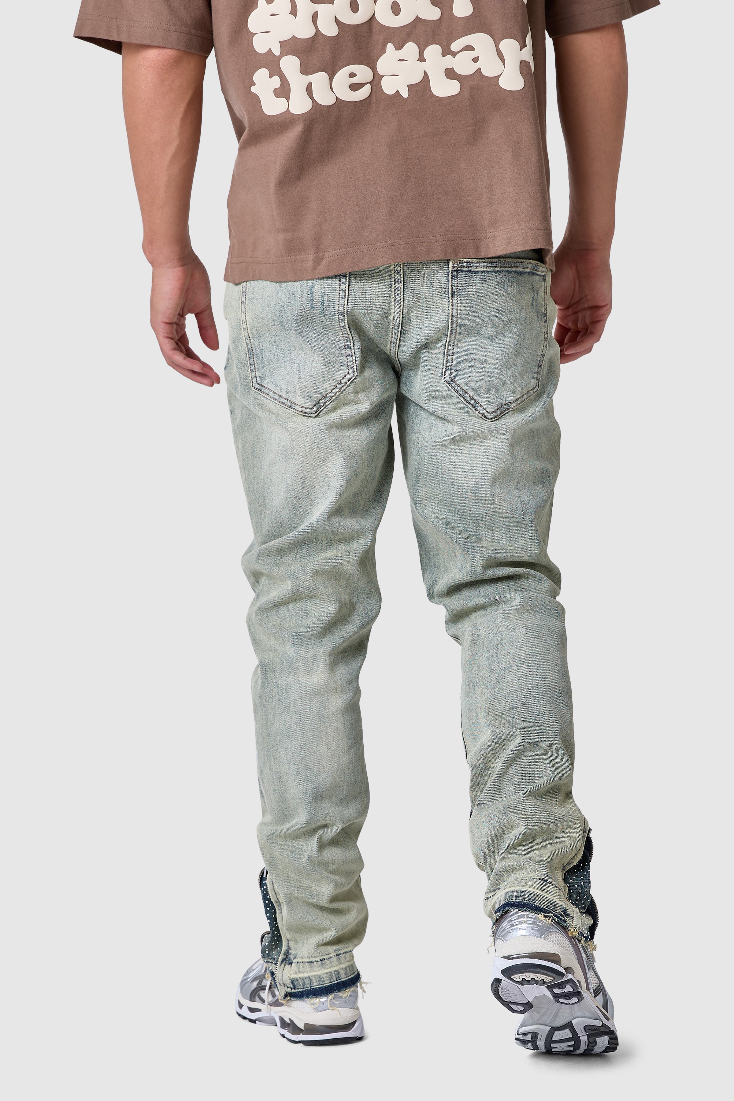 Crafted for a streamlined profile with effortless stacking over footwear, this jean is made in a washed-out light denim with subtle distressing and layered ankle zip detailing, which when worn open showcases an embellished aesthetic for added character.