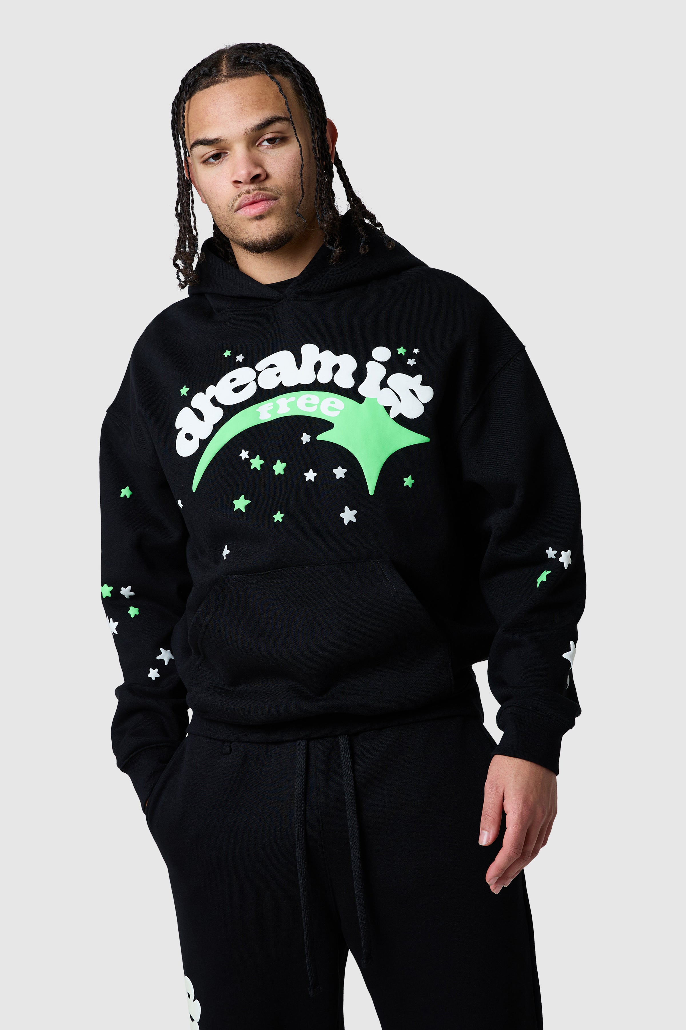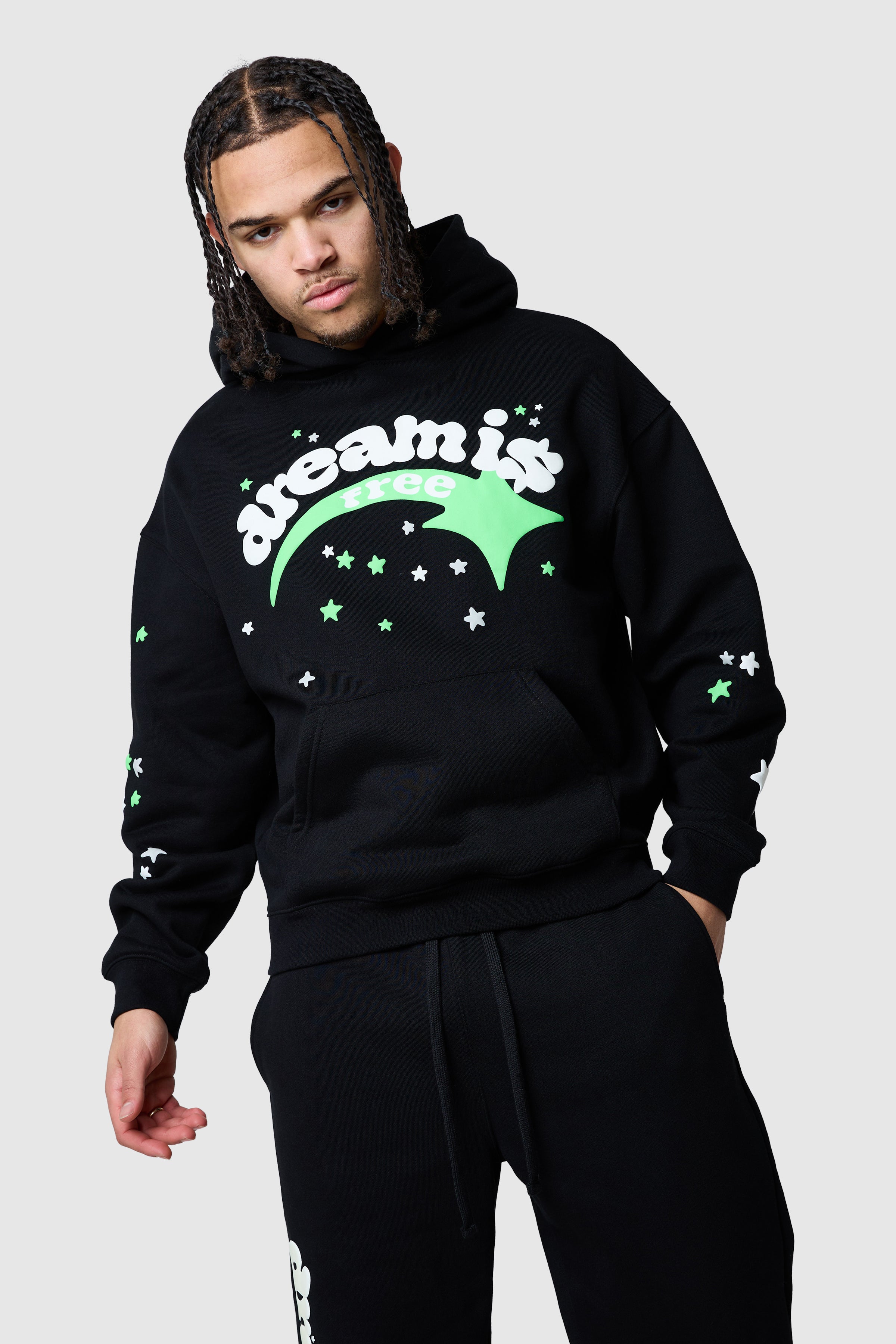 A relaxed hood silhouette built for everyday wear. Shooter Hood in Black features a glow in the dark design graphics across the front and sleeves with a classic kangaroo pocket for functionality and comfort. Pair with the matching Jogger and tee for a full head-to-toe look.