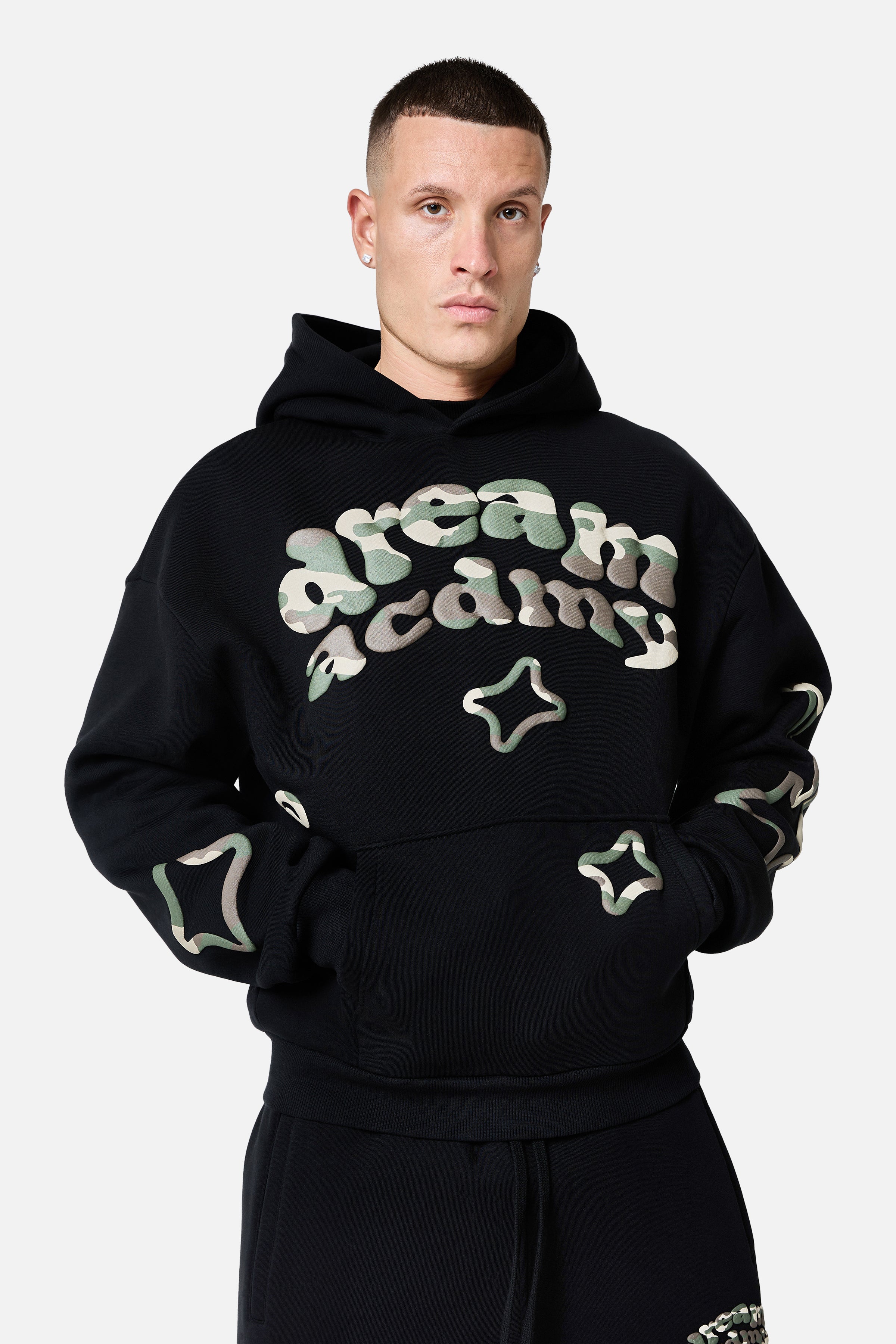 A relaxed hood silhouette built for everyday wear. The Camo Dream Acdmy Hood in black features camo graphic placement across the front and sleeves with a classic kangaroo pocket for functionality and comfort. Pair with the matching Jogger and tee for a full head-to-toe statement look.
